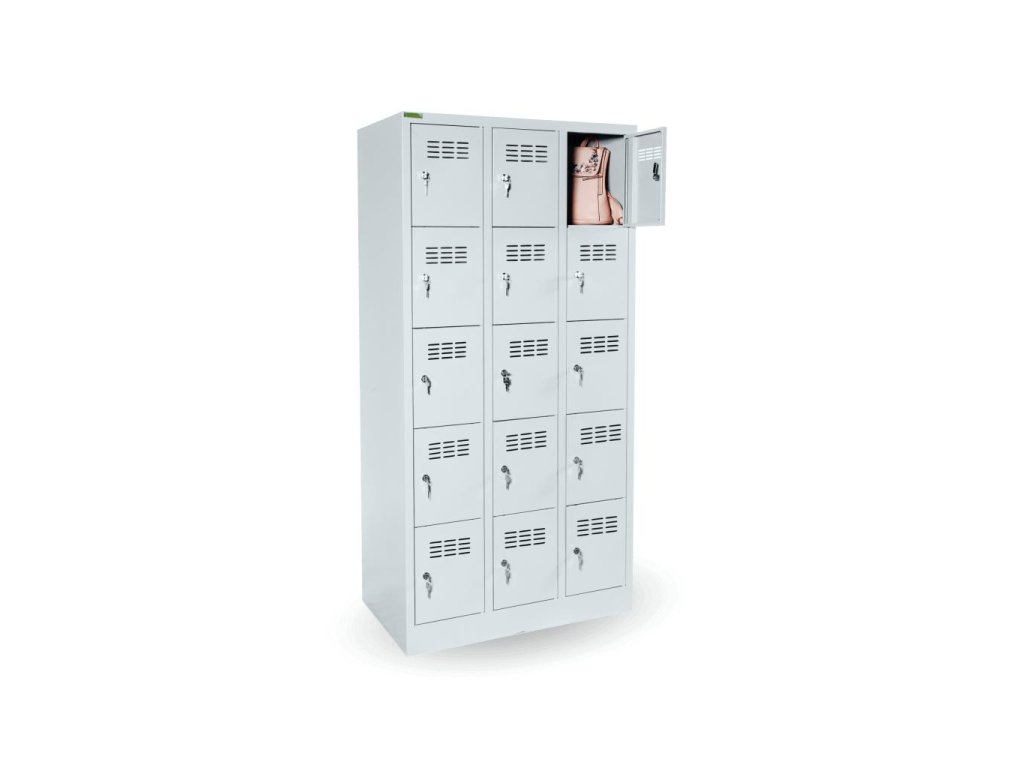 Častokrát nie je praktické nechať si peňaženku, mobilný telefón alebo sendvič na obed v šatni. Skriňa na úschovu cenností s 15 priehradkami je preto veľmi užitočným pomocníkom, vhodná do výroby, do škôl, do nemocníc, do nákupných centier, do wellness, fitness.