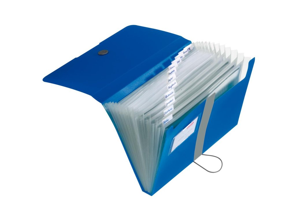 Plastová aktovka produktového radu Easy Orga s 12 plastovými priehradkami s indexami a malou priehradkou vizitkového formátu. Kapacita 300 listov. Uzatváranie gumičkou o plastový krúžok. Väčšie balenie 10 ks. Farba modrá.