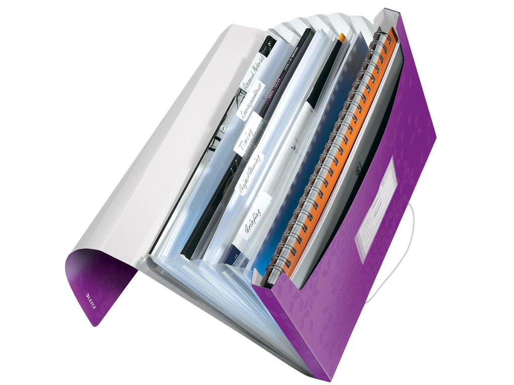 Aktovka z polypropylénu na ukladanie a prenos dokumentov do formátu A4. V dizajne WOW v žiarivých farbách. Atraktívne uzatváranie na gumičku, šesť roztiahnuteľných priehradok s indexami na popis obsahu, jedna priehradka na voľne vložené listy do formátu A4, vrecko na vizitky. Kapacita 250 listov. Väčšie balenie 5 ks. Farba purpurová.