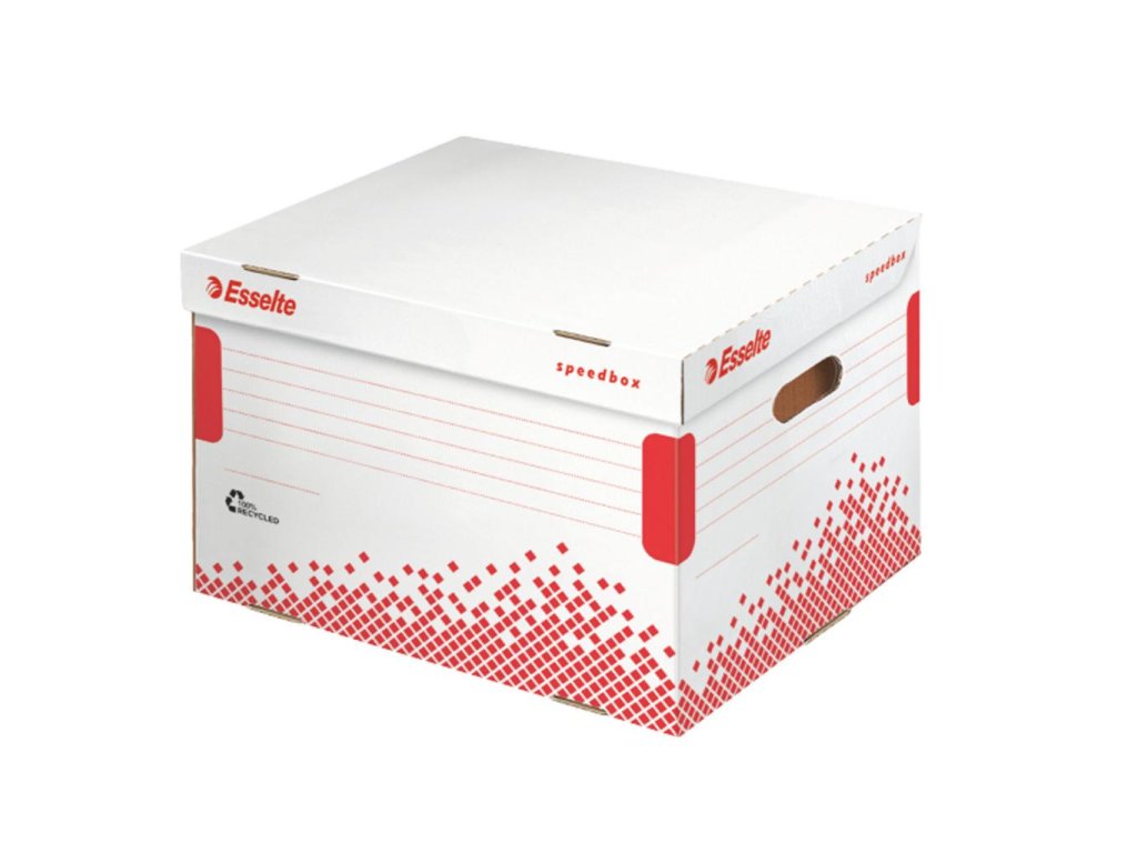 Archívne krabice so sklápacím vekom z archivačného systému Speedbox. Spevnené steny aj dno pre maximálnu pevnosť a odolnosť pri stohovaní. Ideálne na prenos dokumentov alebo rôznych predmetov. Vyrobené zo 100% recyklovanej vlnitej lepenky. Farba biela/ červená. Rozmery 392 × 301 × 334 mm. Kapacita 5 zakladačov šírky chrbta 75 mm. Väčšie balenie 15 kusov.