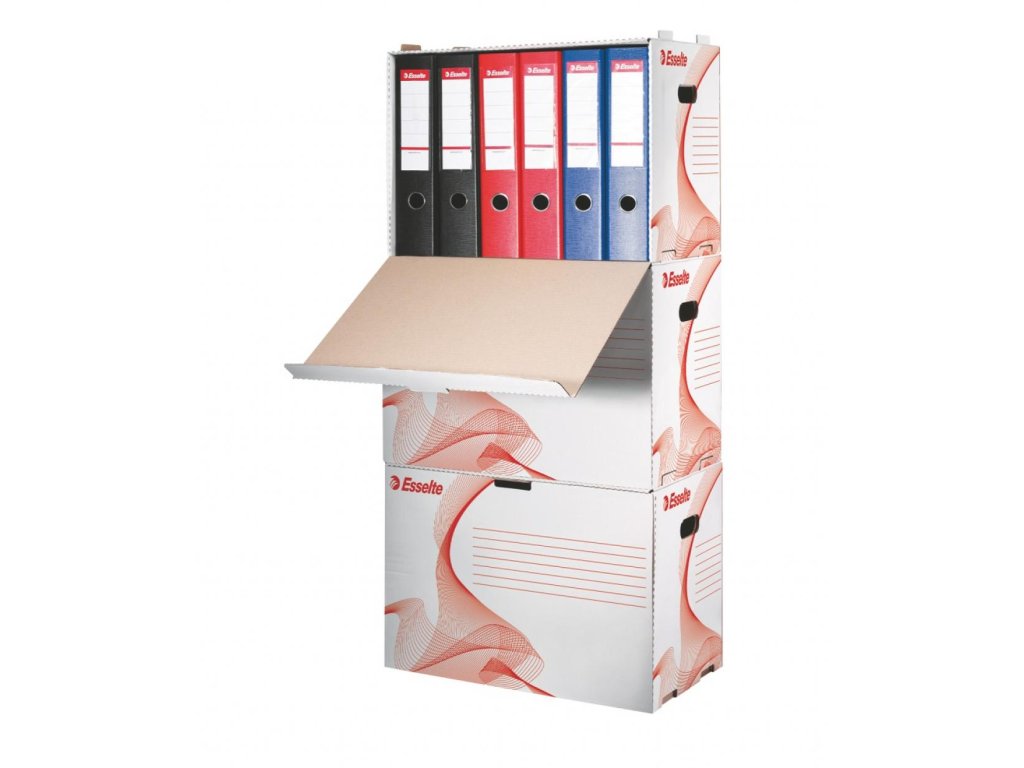 Archívna krabica na prehľadné ukladanie a archiváciu zakladačov. Bočné otvory pre prenášanie, otváranie spredu, predtlač na popis na veku i bokoch. Stabilita pri stohovaní je zaisťovaná vzájomným spojením krabíc pomocou špeciálnych otvorov a úchytov. Kapacita: 10 zakladačov so šírkou chrbta 5 cm, 6 zakladačov so šírkou chrbta 8 cm alebo 6 stojanov na časopisy so šírkou chrbta 8 cm. Väčšie balenie 10 ks.