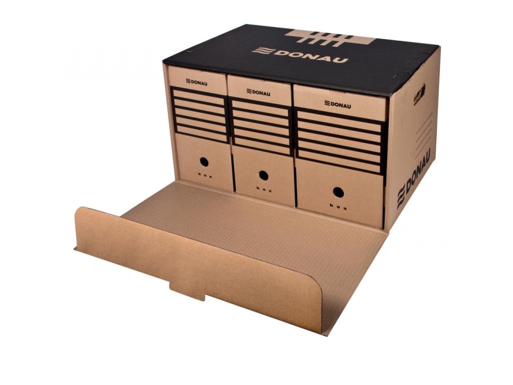 Archívna krabica z trojvrstvovej lepenky gramáže 450 g s certifikátom FSC® (drevo na jej výrobu pochádza z lesov, obhospodarovaných udržateľným spôsobom), bez obsahu kyseliny (pH 7,5). Vhodná na ukladanie a archiváciu archivačných boxov. Rýchlo a ľahko zložiteľná. Bočné otvory na prenášanie, predtlač na popis na bokoch. Dodávaná rozložená. Väčšie balenie 5 ks. Rozmery: 555 × 360 × 315 mm. Kapacita: 6 archívnych boxov so šírkou chrbta 8 cm, 5 archívnych boxov so šírkou chrbta 10 cm, 4 archívne boxy so šírkou chrbta 12 cm, 2 archívne boxy so šírkou chrbta 15,5 cm + 1 archívny box so šírkou chrbta 20 cm alebo 2 archívne boxy so šírkou chrbta 20 cm + 1 archívny box so šírkou chrbta 10 cm.