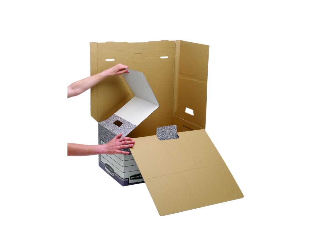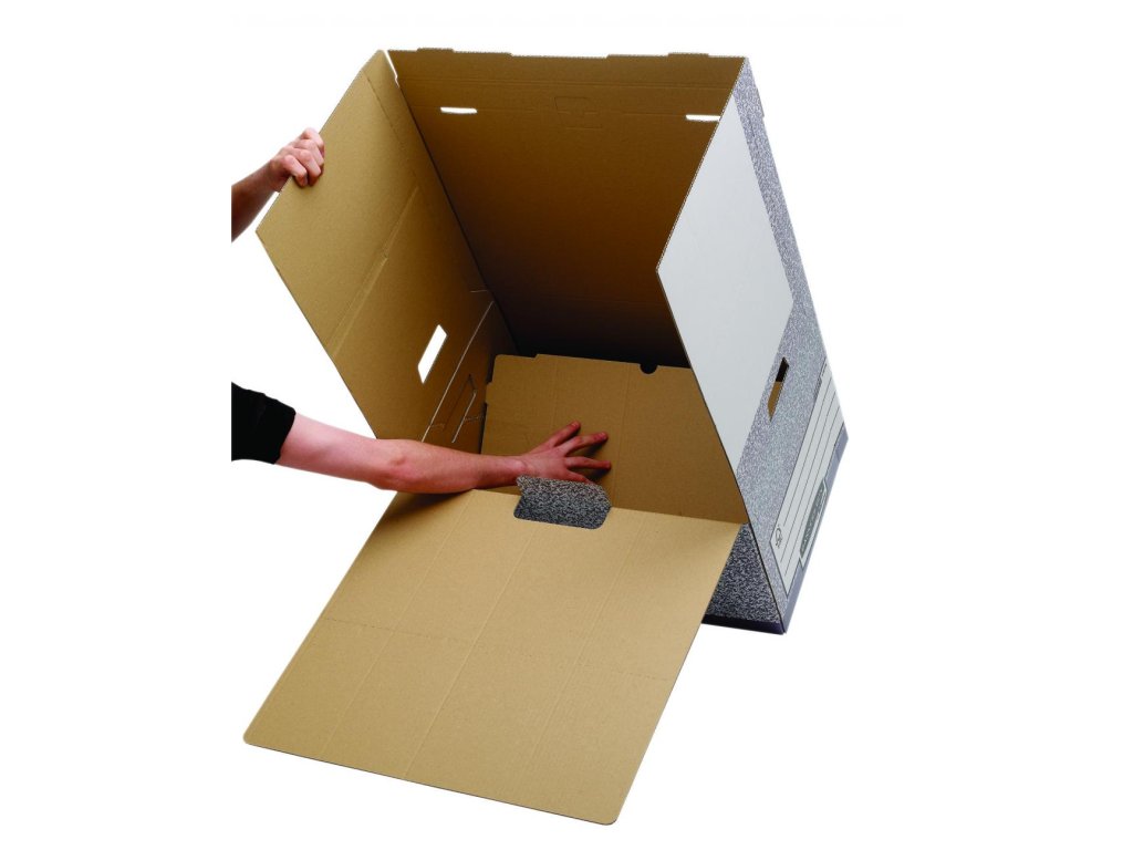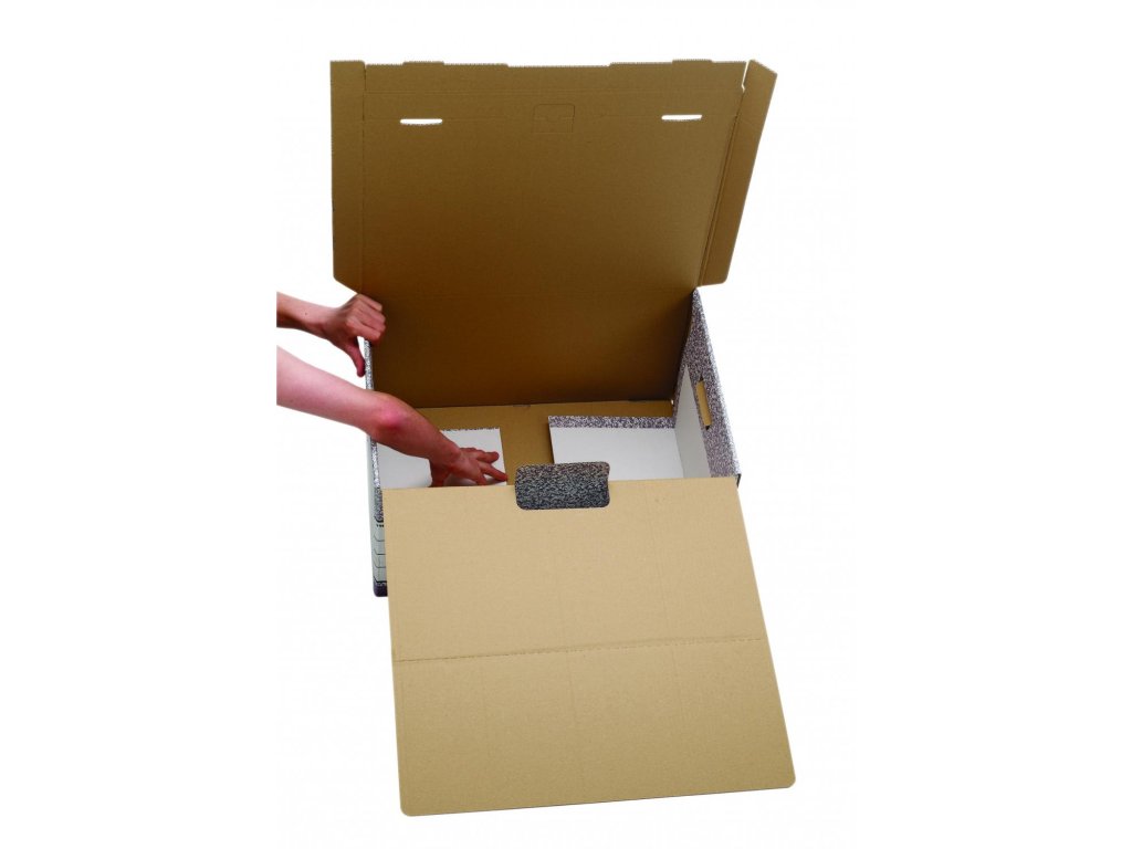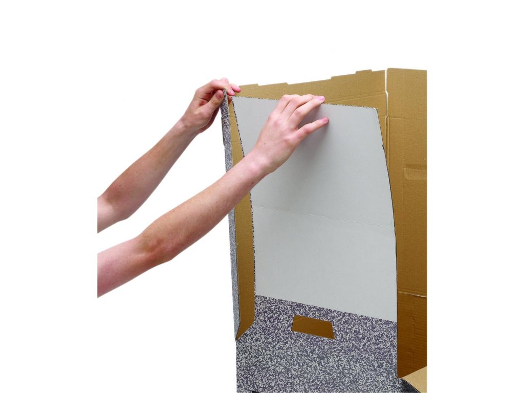 Stabilná krabica s uzatvárateľným sklápacím vekom. Bočné výrezy na uchytenie, steny spevnené zdvojenou vrstvou kartónu. Nosnosť 49,2 kg. Možnosť navyšovania do troch úrovní. Kompatibilná s archívnym boxom. Dodávaná v rozloženom stave naplocho. Väčšie balenie 10 ks. Farba sivá/-biela.
