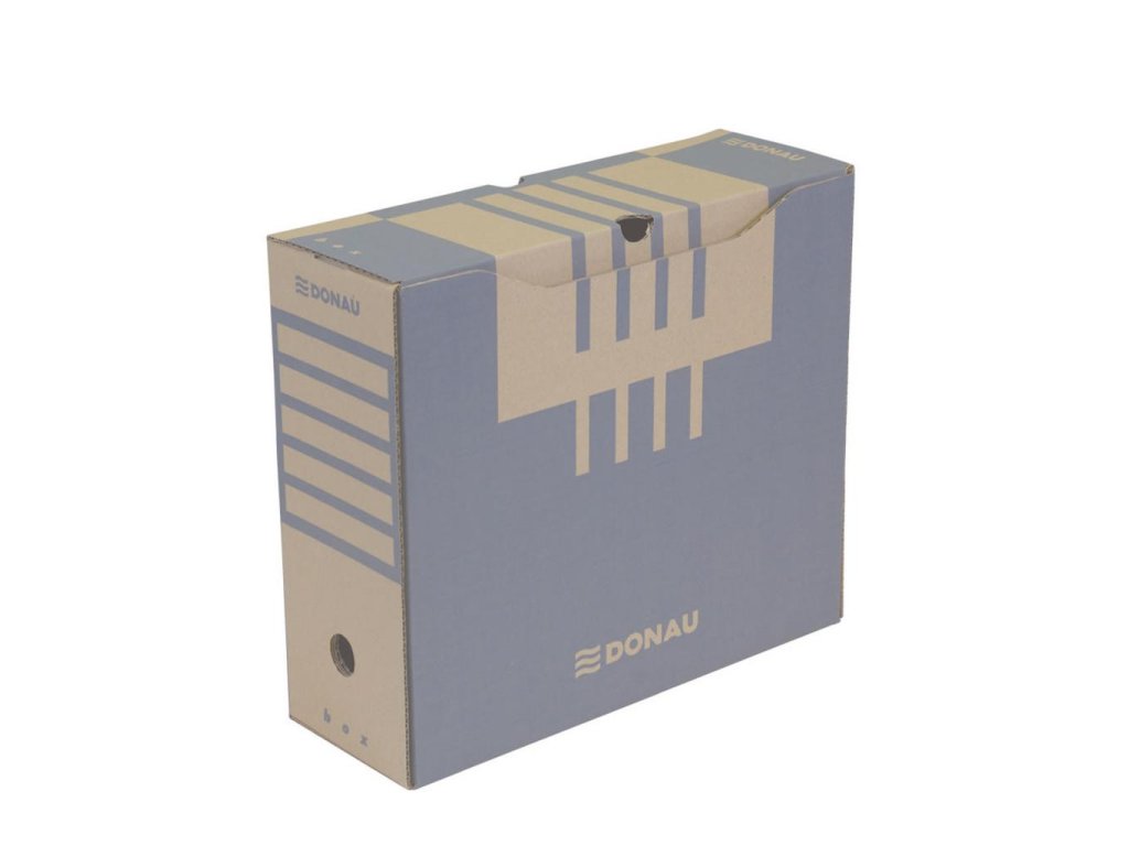 Archívny box z trojvrstvovej lepenky s certifikátom FSC® (drevo na jej výrobu pochádza z lesov, obhospodarovaných udržateľným spôsobom), bez obsahu kyseliny (pH 7,5). Vhodný na archiváciu dokumentov do formátu A4 s otvorom na ľahkú manipuláciu. Možnosť archivovať aj zakladač Donau. Predtlače na popis na dlhšej i kratšej strane umožňuje skladovanie vo vodorovnej aj zvislej polohe. Box je využiteľný samostatne alebo v kombinácii s archivačnými krabicami. Gramáž 390 g. Rozmery 297x120x339mm. Väčšie balenie 20 ks.