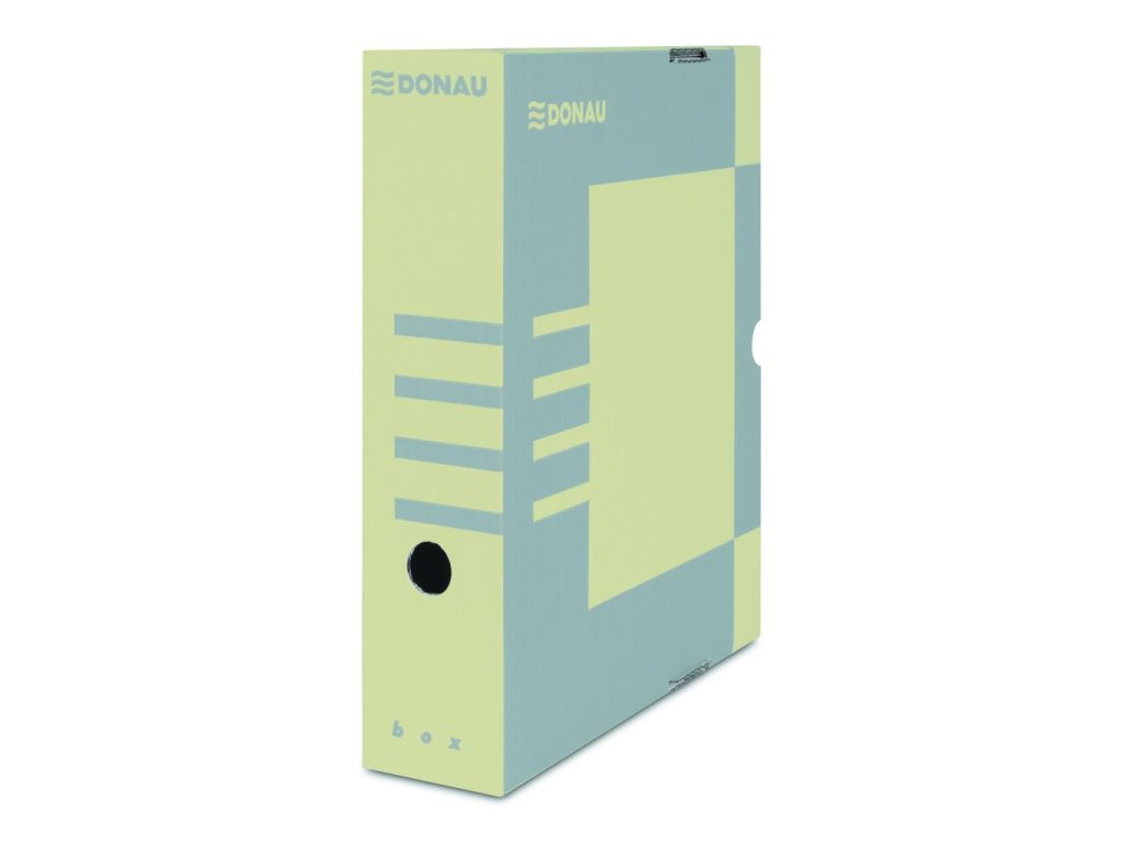 Archívny box z trojvrstvovej lepenky s certifikátom FSC® (drevo na jej výrobu pochádza z lesov, obhospodarovaných udržateľným spôsobom), bez obsahu kyseliny (pH 7,5). Vhodný na archiváciu dokumentov do formátu A4 s otvorom na ľahkú manipuláciu. Možnosť archivovať aj zakladač Donau. Predtlače na popis na dlhšej i kratšej strane umožňuje skladovanie vo vodorovnej aj zvislej polohe. Box je využiteľný samostatne alebo v kombinácii s archivačnými krabicami. Gramáž 390 g. Rozmery 297x80x339mm. Väčšie balenie 20 ks.