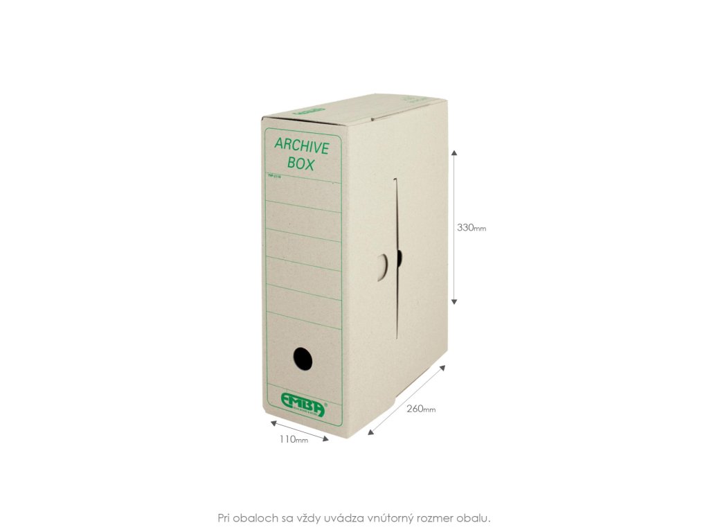 Archívny box z hladkej lepenky na uloženie záznamov do 25 rokov. Používa sa pri rozdelení agendy, účtovných rokov alebo ako firemná farba. Možnosť prehľadného popisu, uloženie v troch polohách. Vhodný v kombinácii so skupinovým boxom - možnosť vložiť 5 boxov I/ 75 alebo kombináciu boxov I/ 50, I/ 75 a I/ 110. Rozmery 110 × 330 × 260 mm. Dodávaný v rozloženom stave. Väčšie balenie 25 ks.