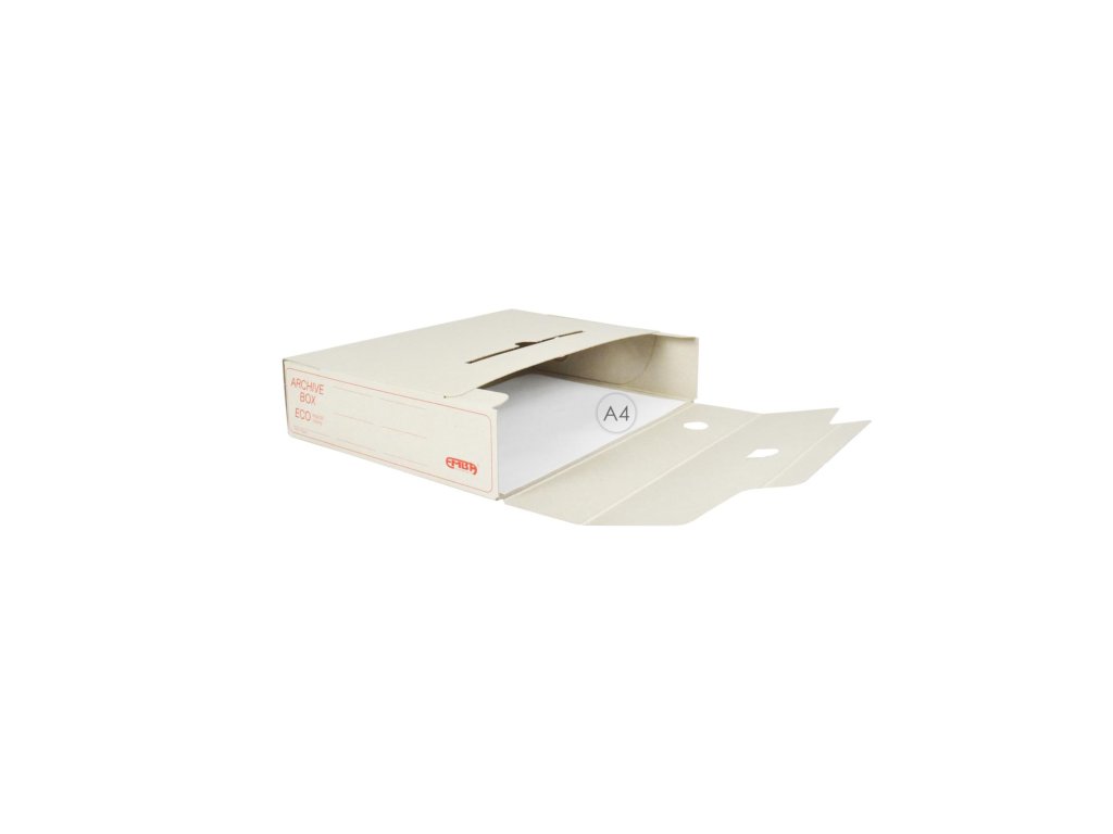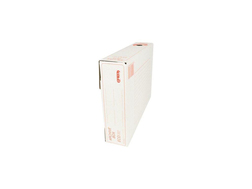 Archívny box ECO A4 sa používa pri rozdelení agendy, účtovných rokov alebo ako firemná farba. Vyrobený z lepenky hrúbky 0,9 mm. Možnosť prehľadného popisu, uloženie v troch polohách. Vhodný v kombinácii so skupinovým boxom - možnosť vložiť 5 boxov I/ 75/ ECO. Ekologicky šetrný výrobok z hladkej ručnej lepenky, 1 000 g/ m². Rozmery 75 × 330 × 260 mm. Dodávaný v rozloženom stave. Väčšie balenie 25 ks.