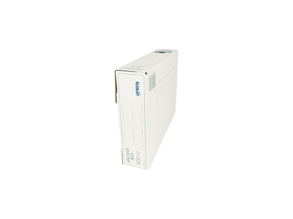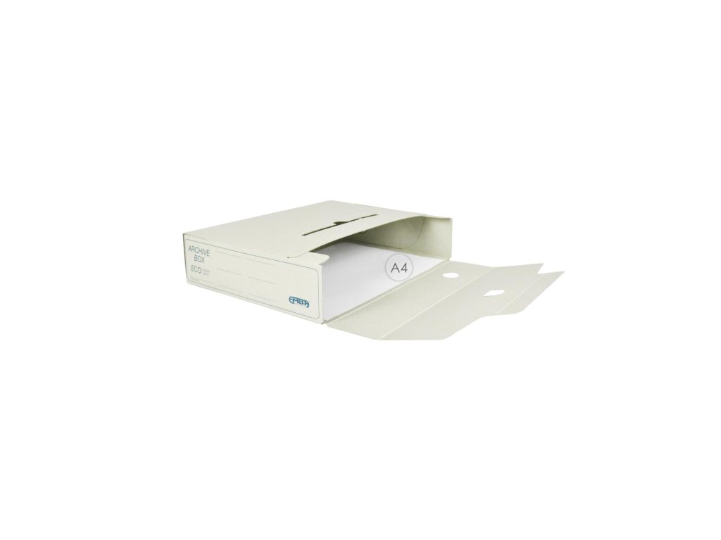 Archívny box ECO A4 sa používa pri rozdelení agendy, účtovných rokov alebo ako firemná farba. Vyrobený z lepenky hrúbky 0,9 mm. Možnosť prehľadného popisu, uloženie v troch polohách. Vhodný v kombinácii so skupinovým boxom - možnosť vložiť 5 boxov I/ 75/ ECO. Ekologicky šetrný výrobok z hladkej ručnej lepenky, 1 000 g/ m². Rozmery 75 × 325 × 240 mm. Dodávaný v rozloženom stave. Väčšie balenie 25 ks.