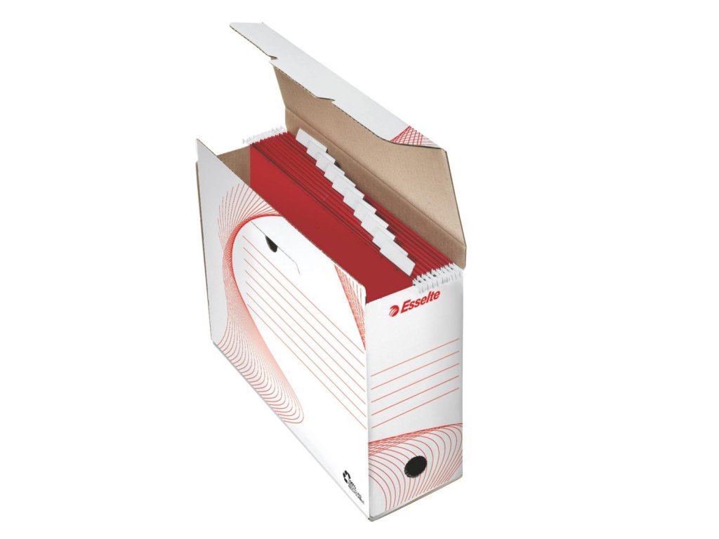 Škatuľa určená na archiváciu dokumentov v závesných obaloch. Šírka chrbta 116 mm. Otvor pre ľahké uchopenie, potlač na kratšej i dlhšej strane umožňuje archiváciu vo vodorovnej i zvislej polohe. Balenie 10 ks. Kapacita 10 závesných obalov.