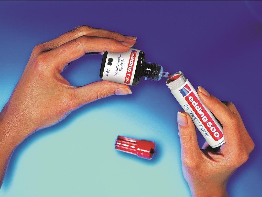 Atrament s kvapkovým dávkovačom na dopĺňanie permanentných popisovačov edding 2000 C, 2200 C, 400, 500, 550, 800, 850, 370 a 390. Pri dopĺňaní vložte prednú časť popisovača špičkou do fľaštičky a po niekoľkých minútach bude popisovač pripravený k opätovnému použitiu. Obsah 30 ml. Tento chemický prípravok je nebezpečný.