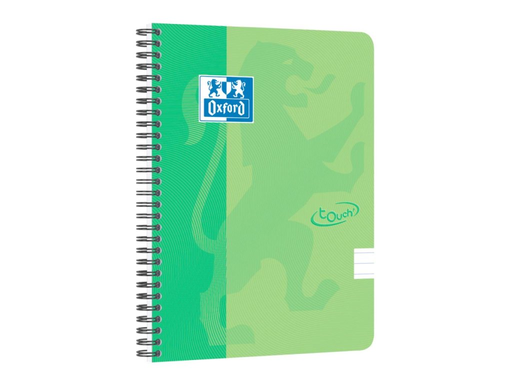 Blok špirálový Oxford Nordic Touch A5+/70 listov linajkový, zelený, na dvojitej čiernej špirále, dosky z tvrdého kartónu so soft touch povrchom, kompatibilný so SCRIBZEE, biely, dokonale hladký papier Optik Paper+, neprepíja, certifikácia EÚ ecolabel.