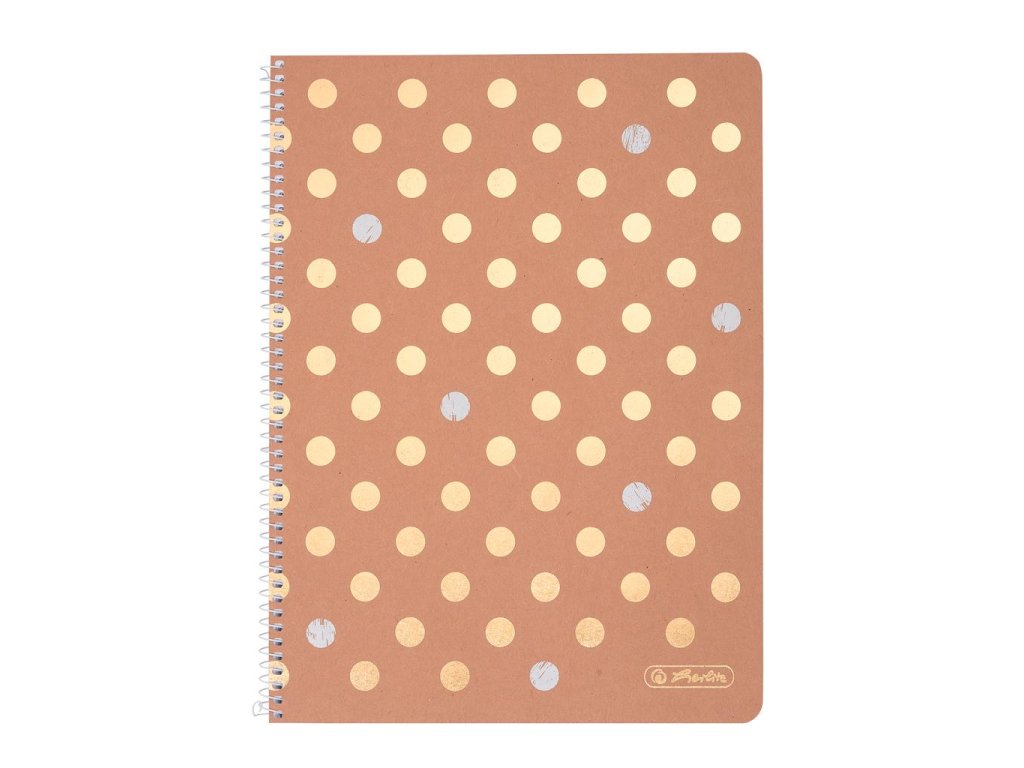 Poznámkový blok Pure Glam formátu A4 má zaoblené rohy, zaoblenú špirálu, eurodierovanie a mikroperforáciu. Papier 70 g / m2, dosky so vzhľadom hrubého papiera s reliéfom zlatých a bielych bodiek, jednoduchá biela špirála.