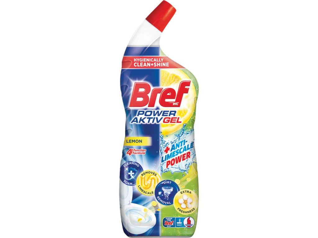 Bref WC gél účinne odstraňuje škvrny, vodný kameň a pomáha udržiavať hygienickú čistotu a sviežosť. Praktický dávkovač dosiahne aj pod okraj misy a odstráni škvrny a vodný kameň. Objem 700 ml. Vôňa Lemon.