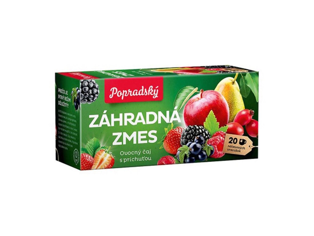 Aromatizovaný ovocný čaj s príchuťou Záhradná zmes. Porciovaný v nálevových vreckách.