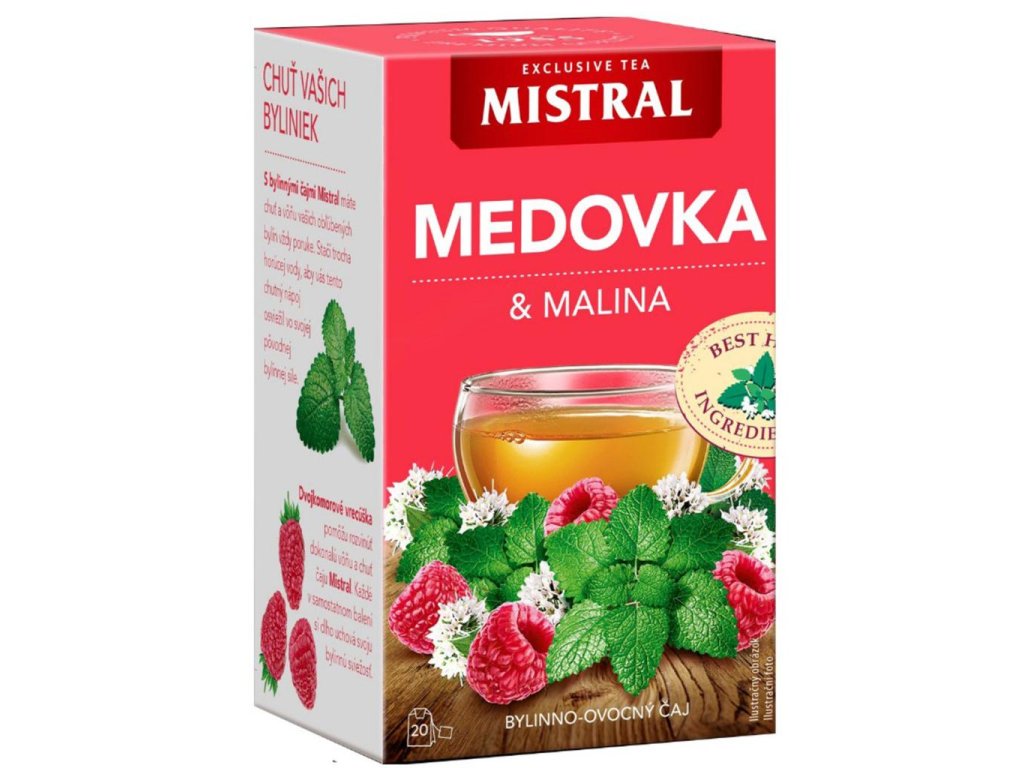 Aromatizovaný bylinno-ovocný čaj Medovka, mäta s príchuťou maliny.
