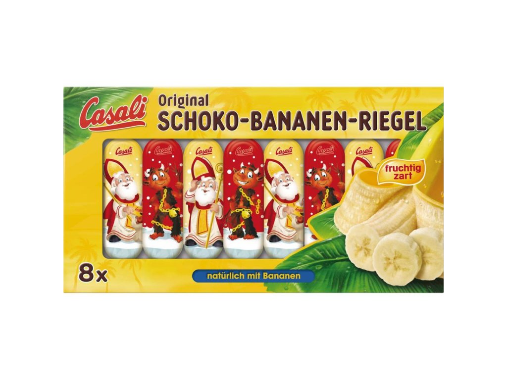 (SK) Penová cukrovinka s banánovou príchuťou, máčané v čokoláde • Zloženie: cukor, glukózový-fruktózový sirup, kakaová hmota, kakaové maslo, banánové pyré (8% v pene), zvlhčovadlo: sorbit, želatína, želírovacie látka: Agar-agar, kyseliaci látka: kyselina citrónová, aróma, emulgátor: sójový lecitín, farbiace látka: kurkumín, pšeničný škrob. Môže obsahovať stopy mliečnych zložiek. Skladujte v suchu pri izbovej teplote. Minimálna trvanlivosť: viď obal. Výživové údaje Ø 100 g: Energetická hodnota: 1 671 kJ / 398 kcal, Tuky 12,3 g, z toho nasýtené mastné kyseliny 7,4 g, sacharidy 69,3 g, z toho cukry 54,3 g, bielkoviny 1,8 g, soľ 0,02 g.