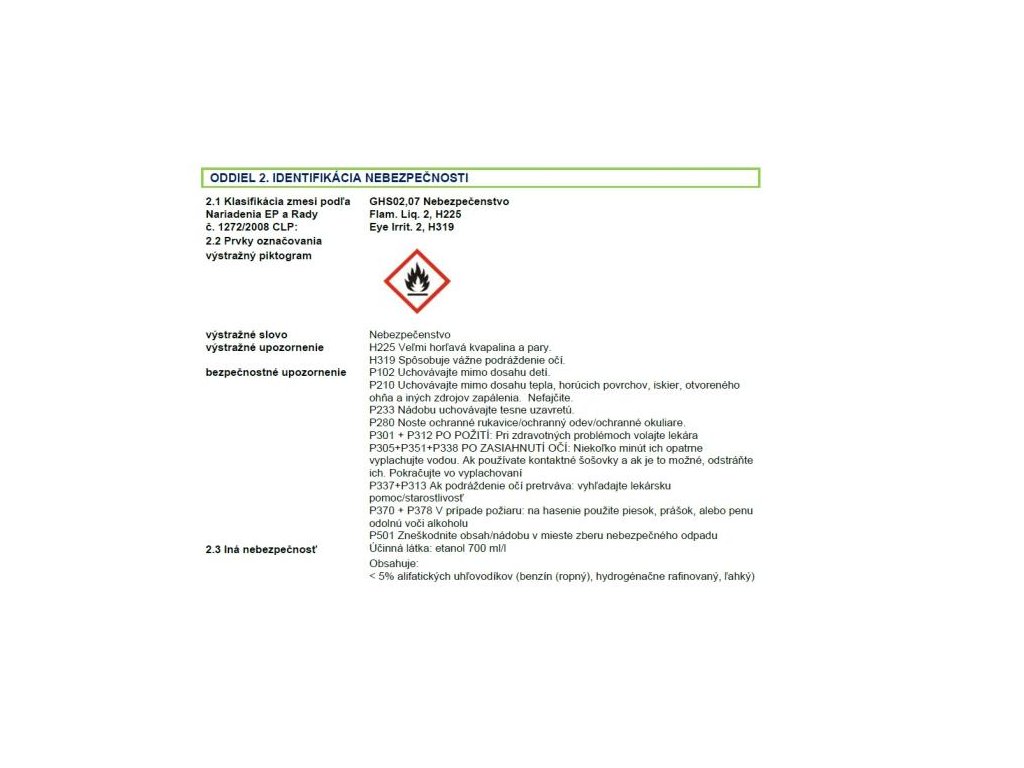 etanol 700 ml/l, < 5% alifatických uhľovodíkov, parfum