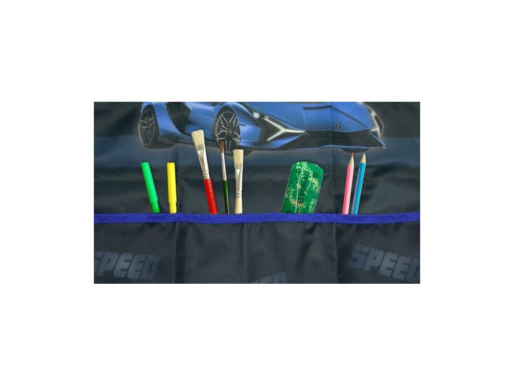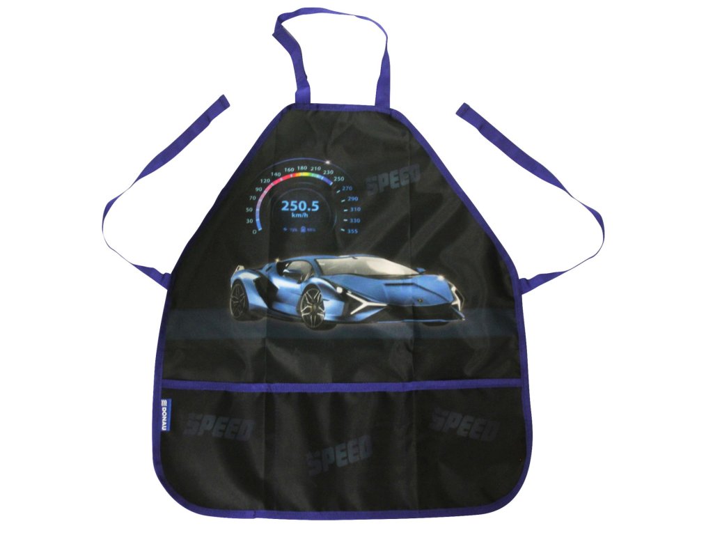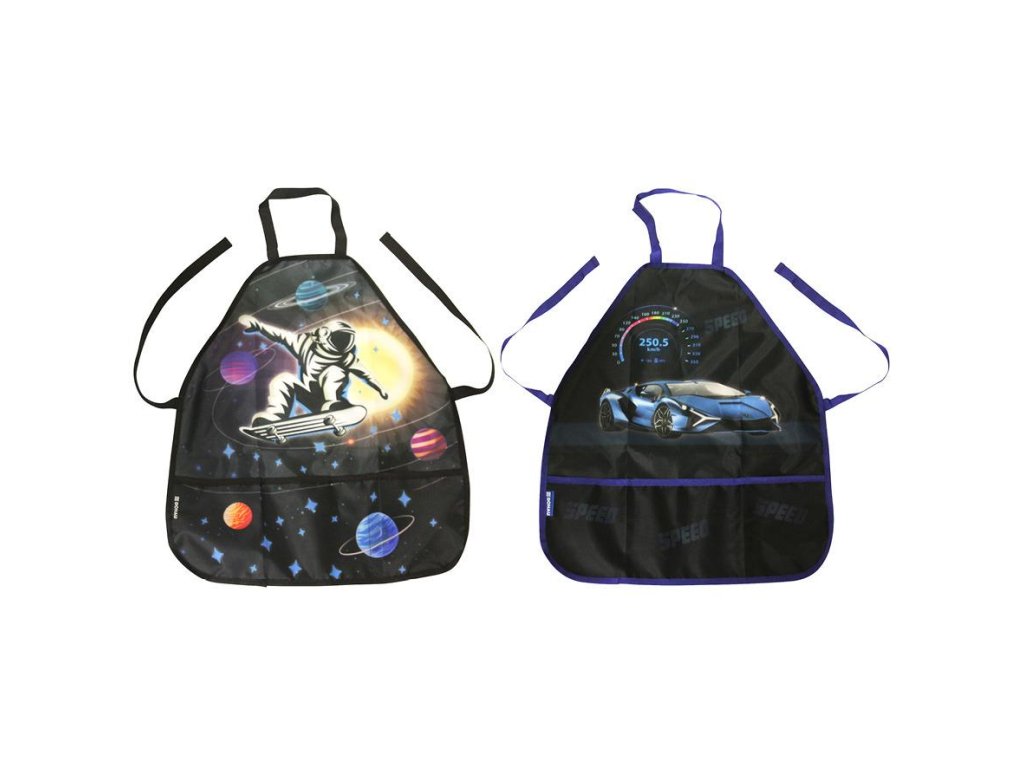 Detská maliarska/remeselnícka zástera v 2 rôznych vzoroch, s veľkým predným vreckom, s 3 vreckami na maliarske a remeselné potreby. Zapínanie na suchý zips pri krku a šnúrky vzadu, vrátane menovky. Materiál: polyester, univerzálna veľkosť: 54 x 46 cm. Motív pre chlapcov.