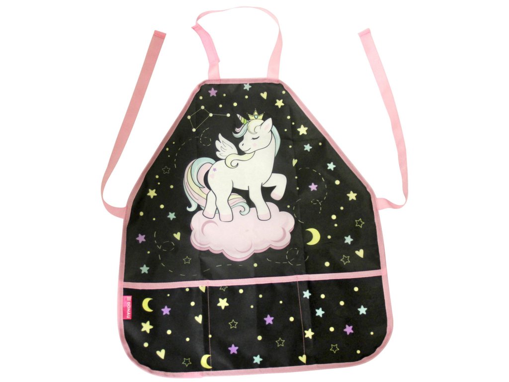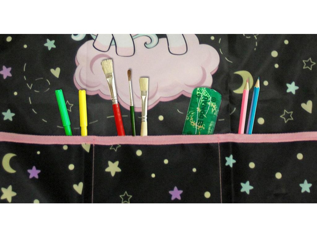 Detská maliarska/remeselnícka zástera v 2 rôznych vzoroch, s veľkým predným vreckom, s 3 vreckami na maliarske a remeselné potreby. Zapínanie na suchý zips pri krku a šnúrky vzadu, vrátane menovky. Materiál: polyester, univerzálna veľkosť: 54 x 46 cm. Motív pre dievčatá.