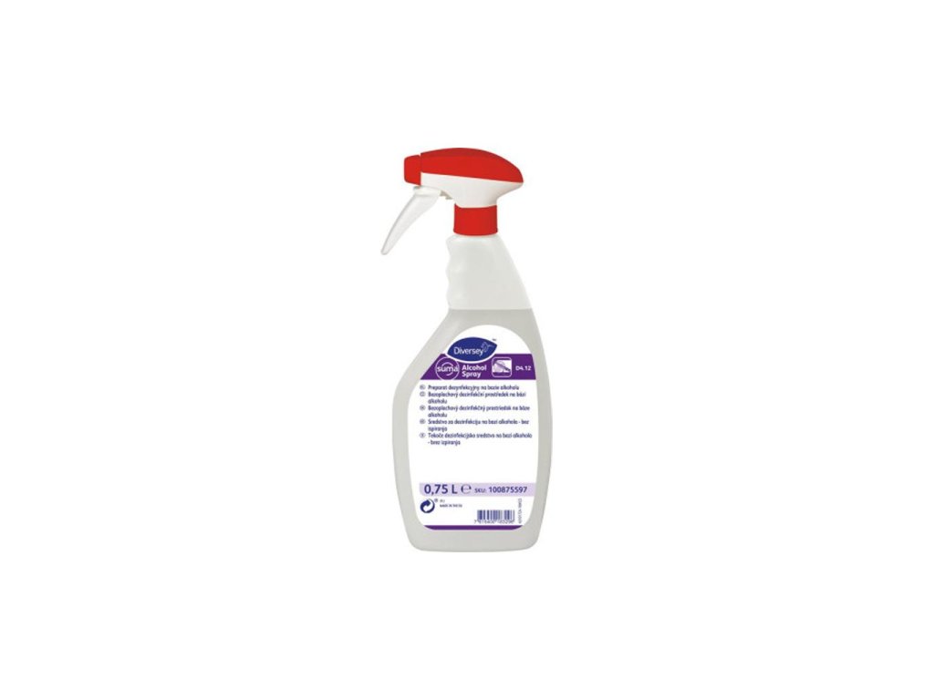 Dezinfekčný prostriedok na sprejovú aplikáciu v priebehu pracovného procesu a aj na konečnú dezinfekciu. Prostriedok je možné použiť na povrchy prichádzajúce do styku s potravinami, rýchlo sa z povrchu odparuje a nezanecháva rezíduá. Možno použiť na povrchy odolné voči alkoholu, napr. pracovné dosky, stroje a predmety, dosky na krájanie alebo nože. Je tiež vhodný na sanitáciu stojanov na potraviny v supermarketoch, mäsiarstve a pod. Suma Alcohol Spray D4.12 je na báze etanolu, ktorý má optimálnu biocídnu účinnosť. Má široké spektrum účinnosti a je efektívny proti väčšine vegetatívnych foriem mikroorganizmov.