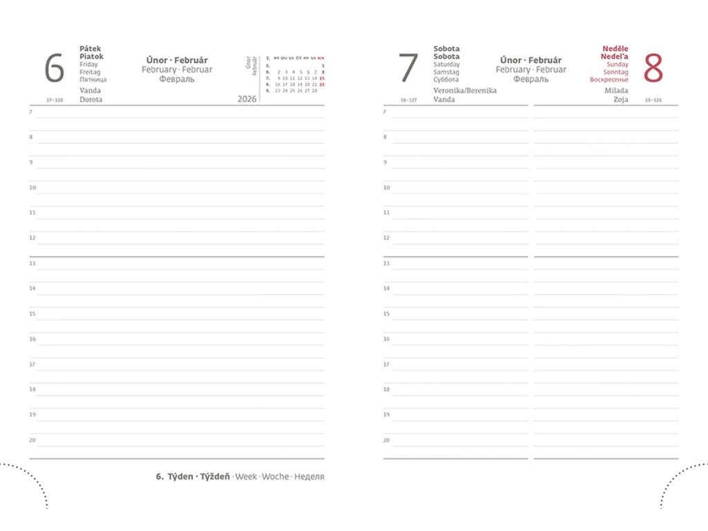 Diár obsahuje: osobné údaje, plánovač dovolenky (mesačný prehľad), plánovací kalendár, telefónne predvoľby, štátne sviatky Českej a Slovenskej republiky, medzinárodné sviatky, ročný výhľad, denný layout, adresár, mapa Európy a Českej a Slovenskej republiky.