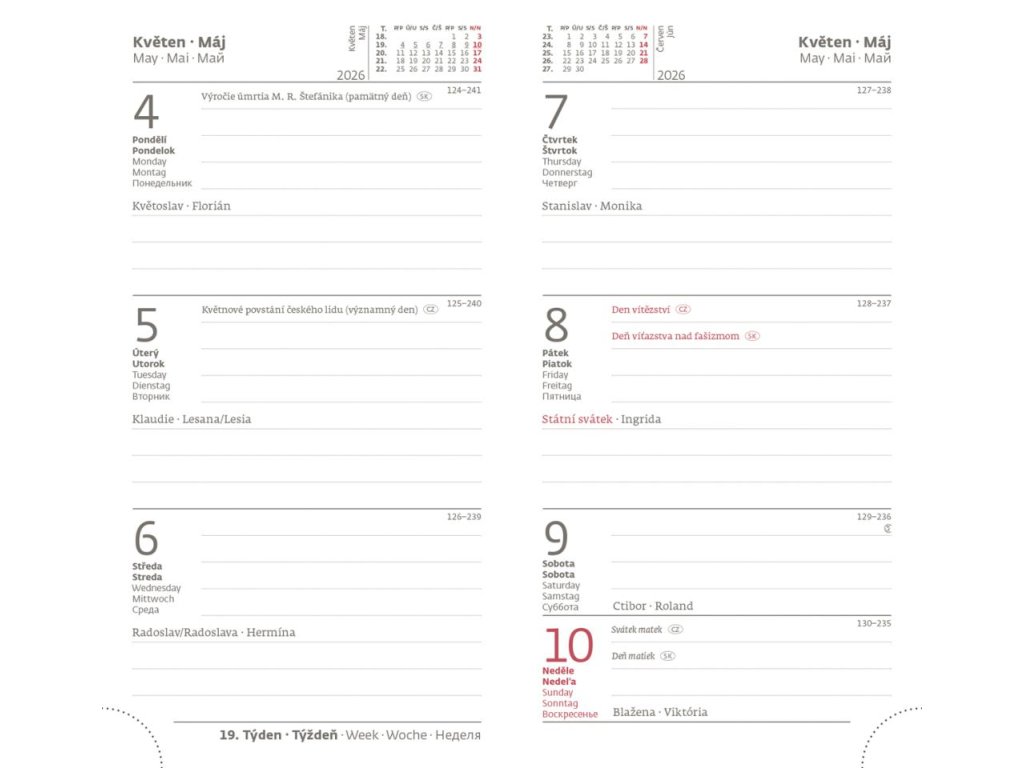 Diár obsahuje: osobné údaje, plánovač dovolenky (mesačný prehľad), plánovací kalendár, medzinárodné sviatky, ročný výhľad, týždenný layout, adresár.