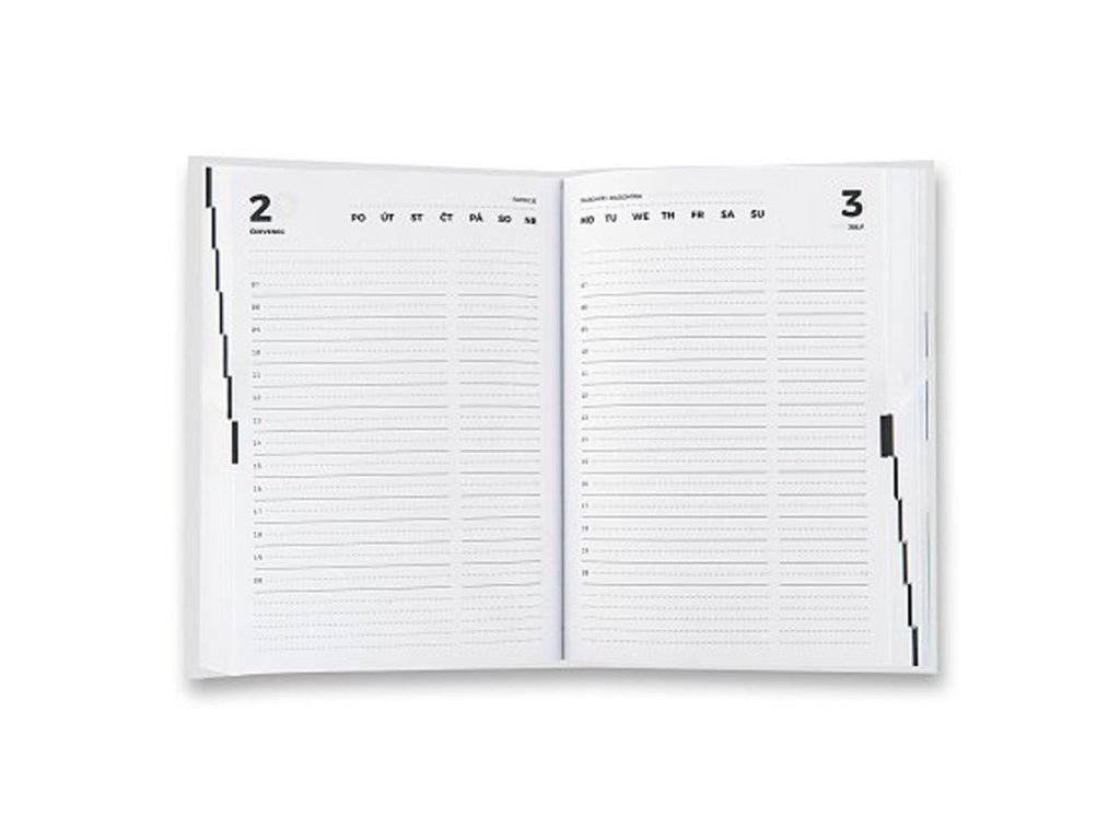 Univerzálny diár na ľubovoľný rok s pevnýmii laminovanými doskami a šitou väzbou.