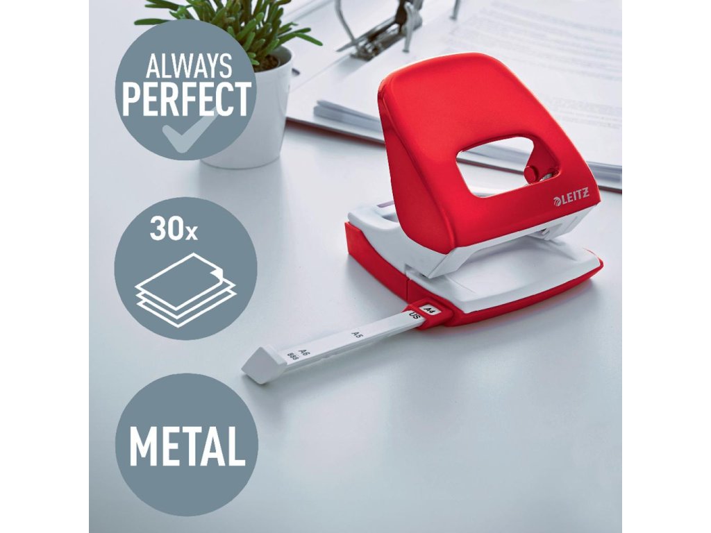 Pevná a spoľahlivá celokovová dierovačka rady WOW v žiarivej farbe. Telo aj rameno vyrobené z kovu, protišmykové plastové dno. Pohodlné vyprázdňovanie odrezkov (dno sa odklopí iba čiastočne), príložník s kontrastnou potlačou formátov, pevná fixácia, patentovaná úchytka a ostrejšie dierovacie segmenty pre vynaloženie menšej sily pri dierovaní. Kapacita dierovania 30 listov. Hmotnosť 378 g. 10 ročná záruka. Farba: červená.