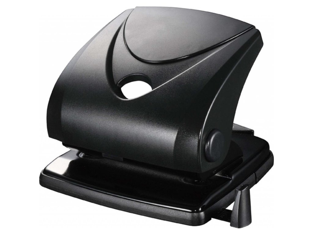 Pevná kancelárska dierovačka s posuvným pravítkom. Mechanika kovová, obal plast. Rozpätie dier 8 cm. kapacita dierovania 27 listov. Farba čierna.