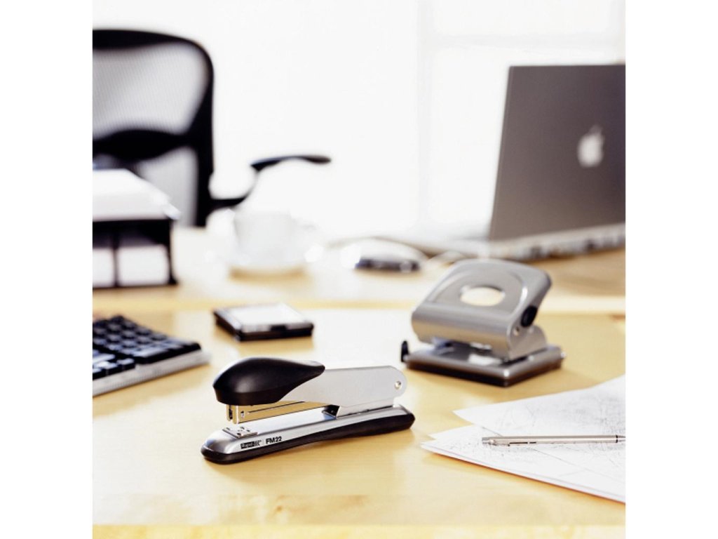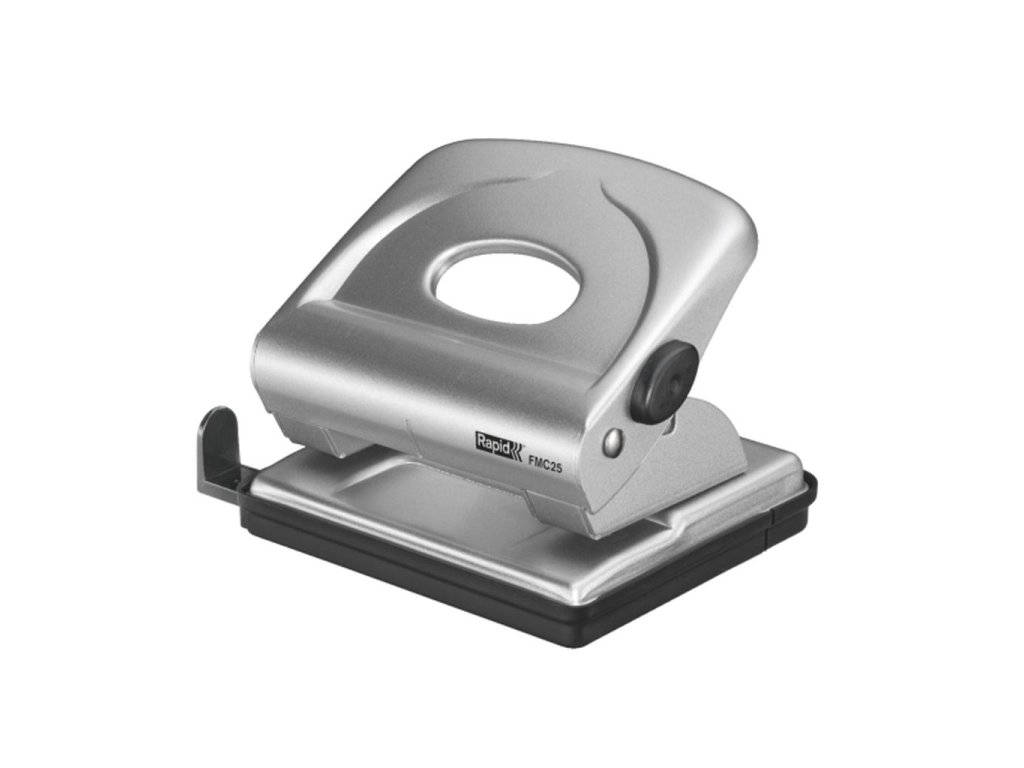 Odolný kovový dierovač s uzamykateľným ramenom na jednoduché skladovanie. Vhodný do kancelárie. Farba strieborná.