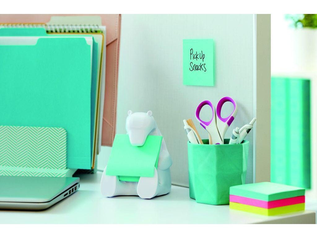 Stolový dispenzor v tvare medveďa dodávaný s balením silne lepiaceho modrého Z-bločku rozmerov 76 × 76 mm, 90 listkov. Zaťažený dispenzor umožní jednoduché vytiahnutie lístka jednou rukou. Farba dispenzora biela.