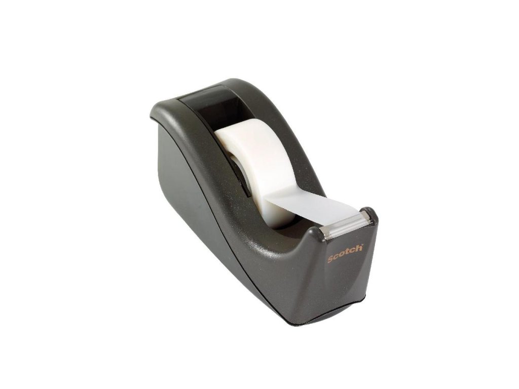 Stolový zásobník na všetky pásky Scotch® so záťažou v modernom dizajne. Zabudovaná vyklápacia cievka a kovový nôž na odrezanie pásky. Súčasťou balenia je jedna Scotch® Magic™ páska rozmerov 19 mm × 33 m. Farba čierna.