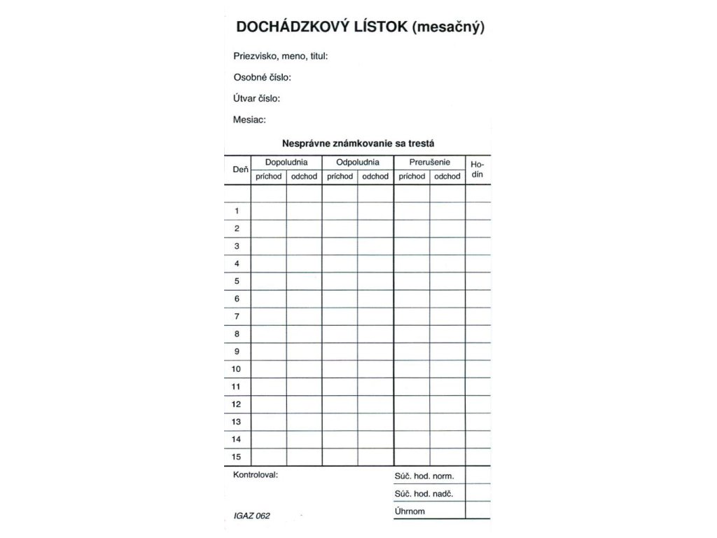 Tlačivo : Dochádzkový lístok mesačný (kartón).