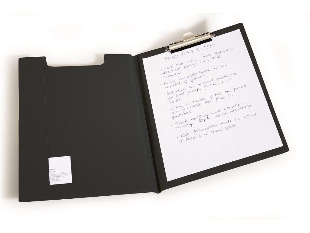 Dosky vyrobené zo spevneného mäkkého PVC. Vrecko po celej dĺžke vnútornej strany predného obalu. Vhodné na dokumenty formátu A4.