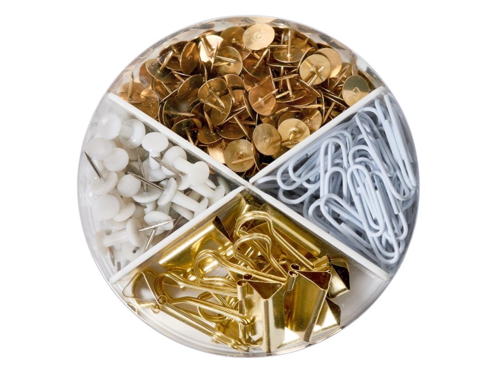Dóza z produktového radu Pure Glam obsahuje: 30 bielych napichovacích špendlíkov, 200 zlatých pripináčikov, 10 zlatých klipov na dokumenty a 70 bielych spisových spon.