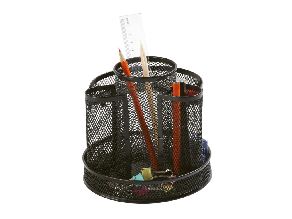Drôtený organizér s ľahkým prístupom na všetky strany vďaka možnosti otáčania. 4 priehradky na kancelárske potreby, 1 na gumy, sponky, spinky a pod., gumené nožičky. Rozmery (š × v × h) 165 × 165 × 160 mm. Farba čierna.