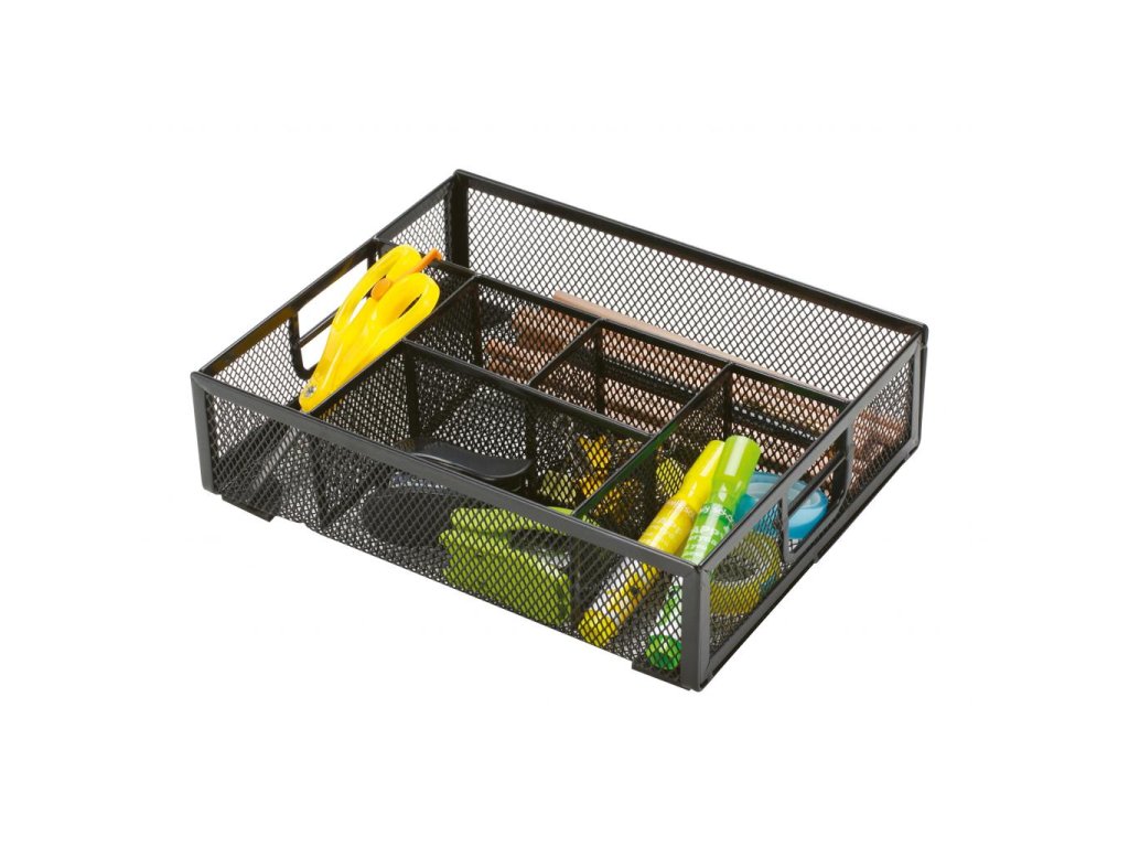 Drôtený organizér s protišmykovými nôžkami a 6 priehradkami - 1 veľkou, 3 strednými a 2 malými. Rozmery (š × v × h) 235 × 183 × 65 mm. Farba čierna.