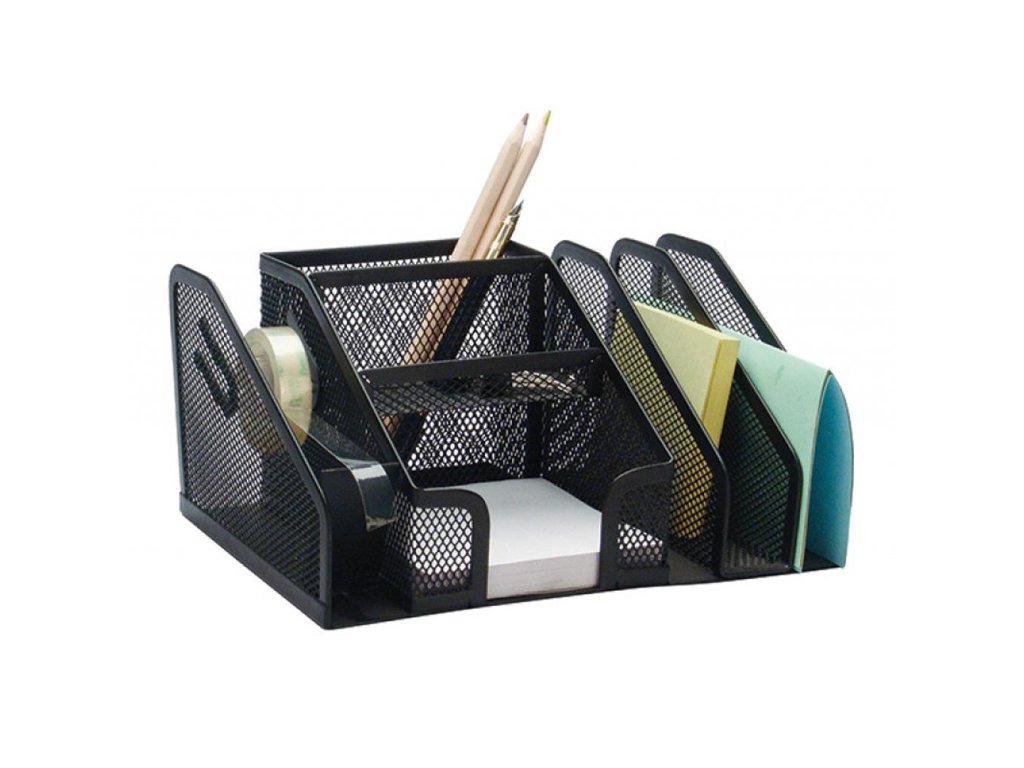Kombinovaný stojan v drôtenej úprave so 6 priehradkami a strihačom pásky. Vhodný na ceruzky a perá, vizitky, papierovú kocku a kancelárske dokumenty. Rozmery (š × v × h) 205 × 145 × 100 mm. Farba čierna.