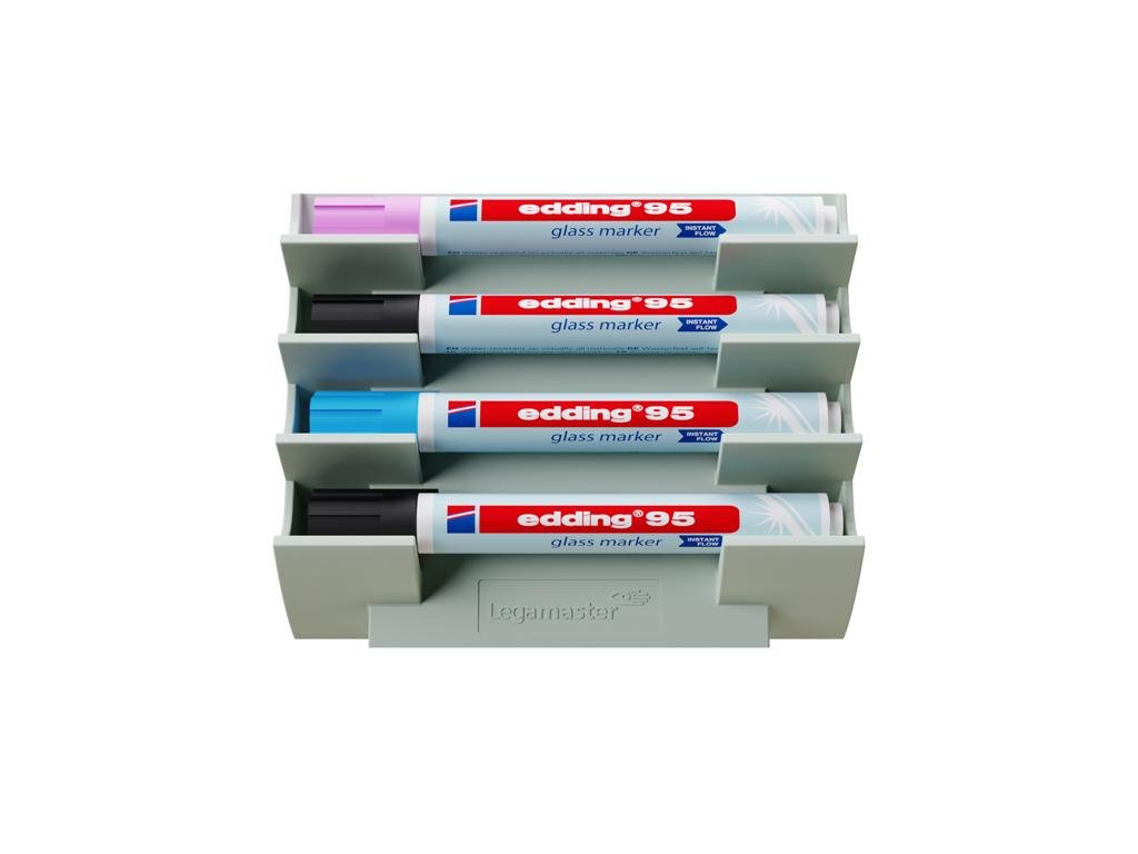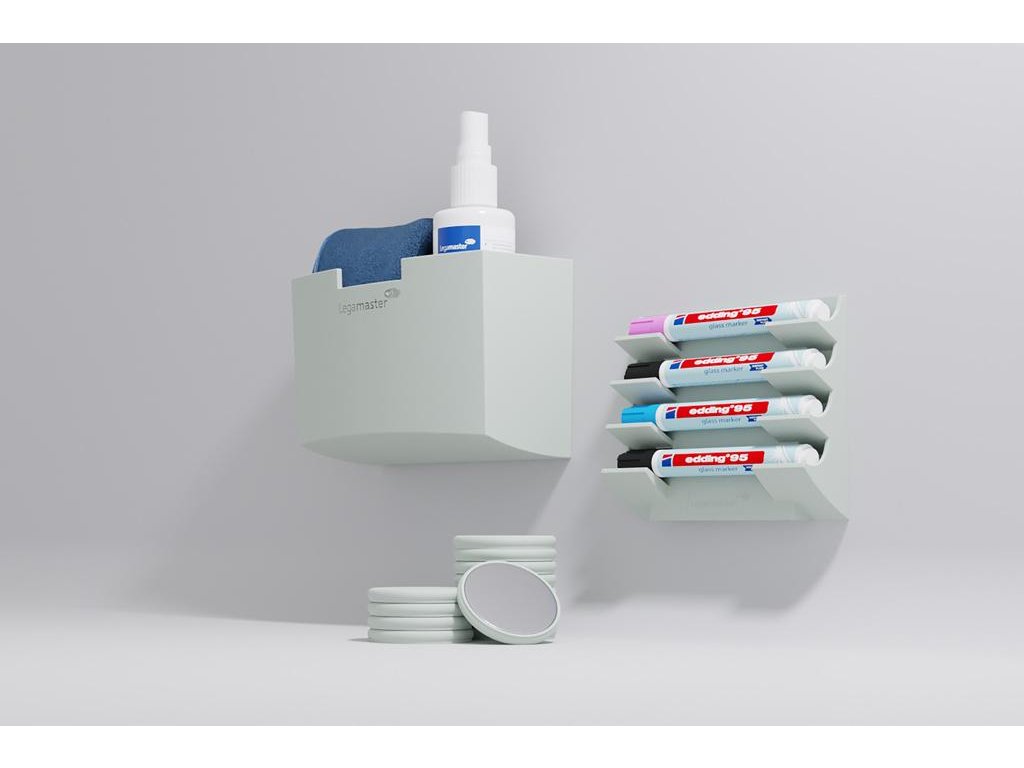 Ideálne riešenie na uloženie tabuľových popisovačov. Podporuje zásady čistého pracovného stola a pomáha udržiavať poriadok v kancelárskych priestoroch. Majte svoje značky vždy na dosah. Magnetické: jednoduché pripevnenie a premiestnenie. Značky sú uložené vo vodorovnej polohe pre optimálnu kvalitu atramentu pri písaní. Magnetický držiak popisovačov na sklenené tabule. Pojme až 4 popisovače na tabuli. Vhodné pre sklenené tabule s povrchom magnetickej tabule. Dodáva sa s extra silným neodýmovým magnetom pre použitie na sklenené dosky. Presne ladí s farbami matnej sklenenej dosky Legamaster sage green. Značky nie sú súčasťou dodávky.