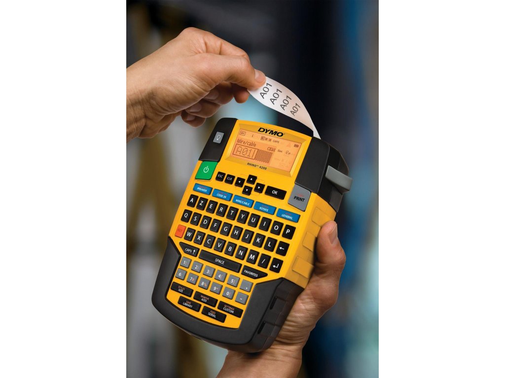Priemyselný kompaktný a časovo úsporný model etiketovacieho zariadenia pre profesionálov. Klávesnica počítačového typu QWERTY s jednoduchou navigáciou, jednodotykové prístupové tlačidlá na vytváranie a formátovanie štítkov na vodiče, káble, vlajočky, čiarových kódov Code 39 a Code 128, štítkov s pevnou dĺžkou, univerzálnych štítkov a štítkov rozvádzačov. Nové tlačidlá Favorites (prístup k často používaným štítkom, symbolom a výrazom) a Custom, ktoré umožňuje uložiť vlastné nastavenie a vyhnúť sa opakovaniu krokov. Rhino™ 4200 tlačí na pásky Rhino z fl exibilného nylonu, vinylu a permanentného polyesteru, ale tiež na štandardné pásky D1. Napájanie 6 batériami AA, adaptérom alebo cez dobíjateľný batériový blok pri súčasnom zakúpení adaptéra. Batérie, adaptér, ani dobíjateľný blok nie sú súčasťou balenia. Vo verzii s kufríkom je súčasťou balenia adaptér, dobíjací batériový blok a 1 vinylová páska.