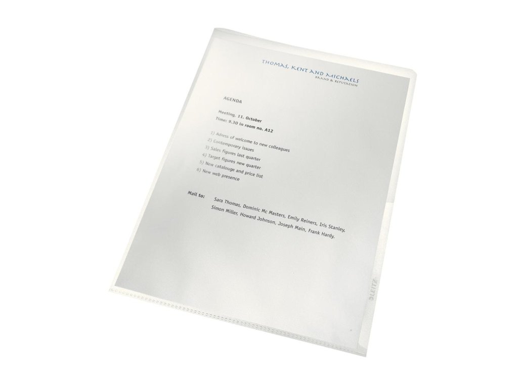 Ekologický priehľadný obal `L` na dokumenty vyrobený zo 100% priemyselného polypropylénu PP. Súčasť ekologického radu Leitz Re:cycle. Zo 100% recyklovaného a 100% recyklovateľného materiálu. Embosovaná PP fólia 0,14 mm (Copysafe). Vykrojenie pre jednoduchšiu manipuláciu s dokumentmi. Pre formát A4. Kapacita: 40 listov A4 (80 g/m2)