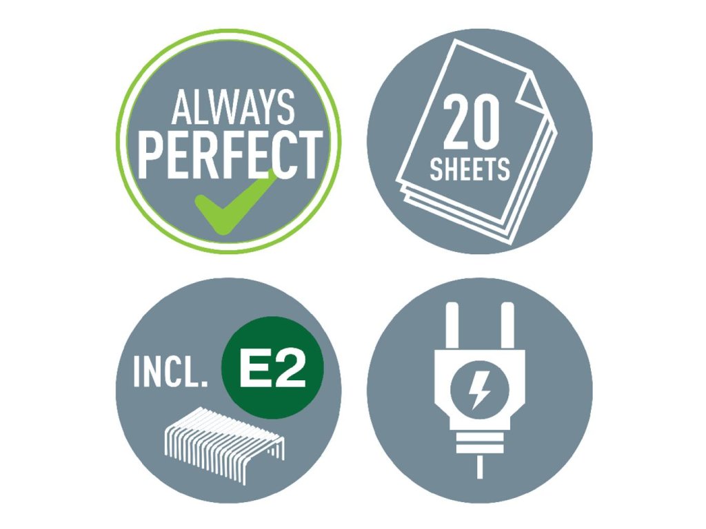 Rýchle zošívanie bez námahy. Ideálna na časté použitie. Vysoký výkon. Jednoduché ovládanie jednou rukou. Plochá technológia ušetrí pri archivovaní až 30 % miesta. Drôtiky Leitz Electric E2 zaručujú pri každom použití dokonalé zošitie bez zasekávania. Kapacita zošívania: 20 hárkov (80 g/m2)