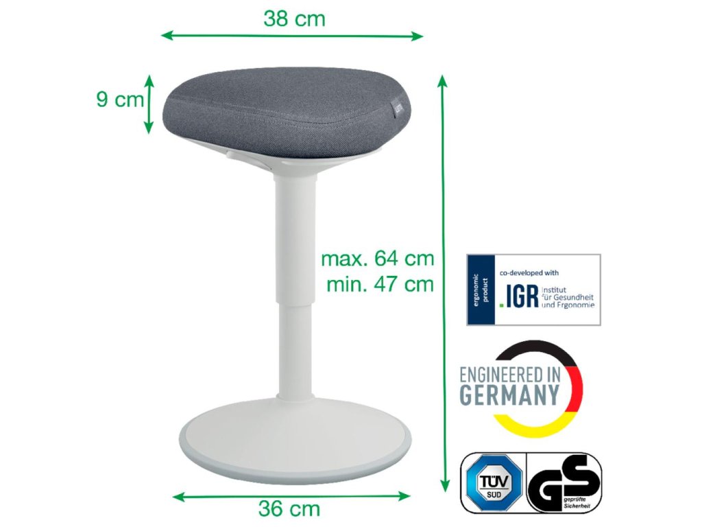 Pre perfektnú oporu pri sedení pri stole vďaka výškovému nastaveniu vhodné pre pevné stoly každú telesnú výšku. Jedinečné, vysoko pohodlné a ergonomické sedadlo s penou s dvojitou hustotou; vyvinuté v spolupráci s IGR. Udržuje vaše svaly aktívne vďaka hojdacej základni. Jednoduché nastavenie výšky vďaka technológii plynových pružín, stlačte jedno z 3 tlačidiel bez ohľadu na polohu sedenia. Protišmyková základňa.