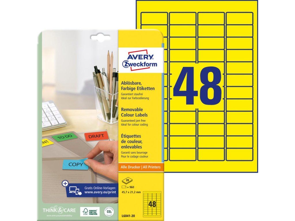 Odnímateľné samolepiace etikety STICK & LIFT odlepiteľné a znovu prelepiteľné (na bežnom povrchu až 5×) bez toho, aby zanechali stopy lepidla. Sú vhodné pre všetky druhy tlačiarní a kopíriek. Využiteľné najmä na každodenné pracovné činnosti, ako napr. vytváranie popisov, cenoviek, označovanie výrobkov, majetku a pod. Farba žltá. Etikety na hárku 48 ks. Balenie 20 hárkov.