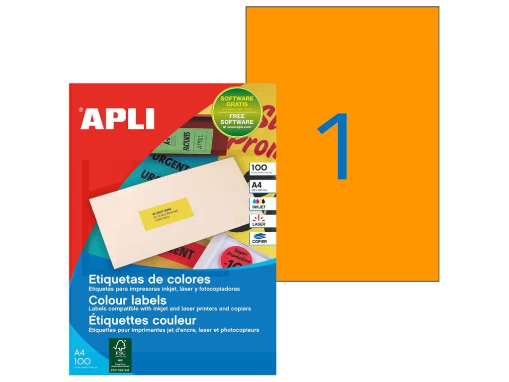 Etikety farebné 210x297mm APLI A4 100 hárkov fluo oranžové