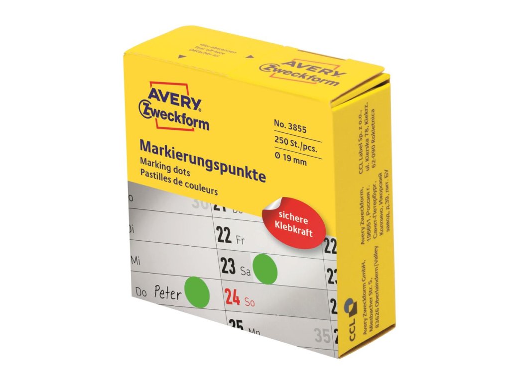Praktické balenie kruhových etikiet na role s jednoduchým a rýchlym samoobslužným prístupom k etiketám. Balenie krabička. Farba zelená.