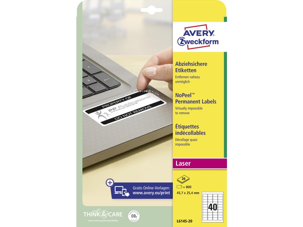 Etikety Avery Zweckform so skvelou ochranou pred neoprávnenou manipuláciou. Ak sa pokúsi niekto etiketu odstrániť, materiál sa rozpadne a etiketu bude možné odlepiť len po veľmi malých častiach. Tieto etikety sa skvele hodia na bezpečnostné značenie, kalibračné značky a inšpekčné plomby. Etikety sú navyše odolné voči mastnote, špine, vode a teplotám od -40 °C do +120 °C. Rozmer 45,7 x 25,4 mm, 800 etikiet.