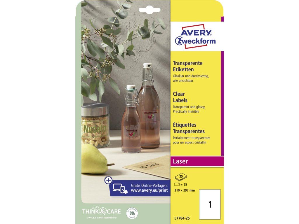 Etikety polyesterové veľmi odolné 210x297mm Avery A4 25 hárkov priehľadné