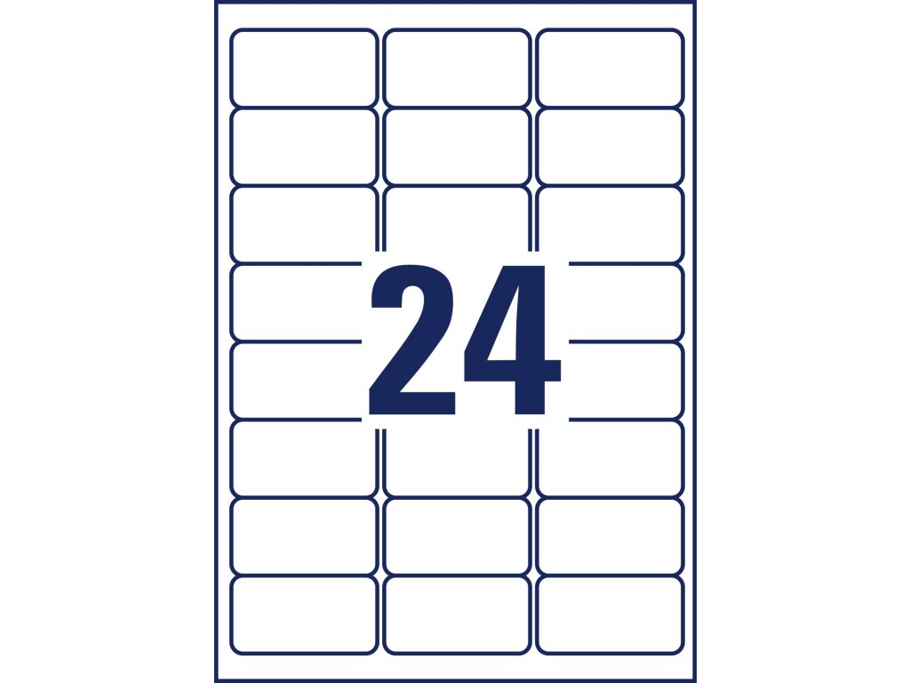 Rozmery v mm : 63,5 × 33,9. Farba biela. Etikety na hárku 24 kusov. Balenie 20 hárkov.