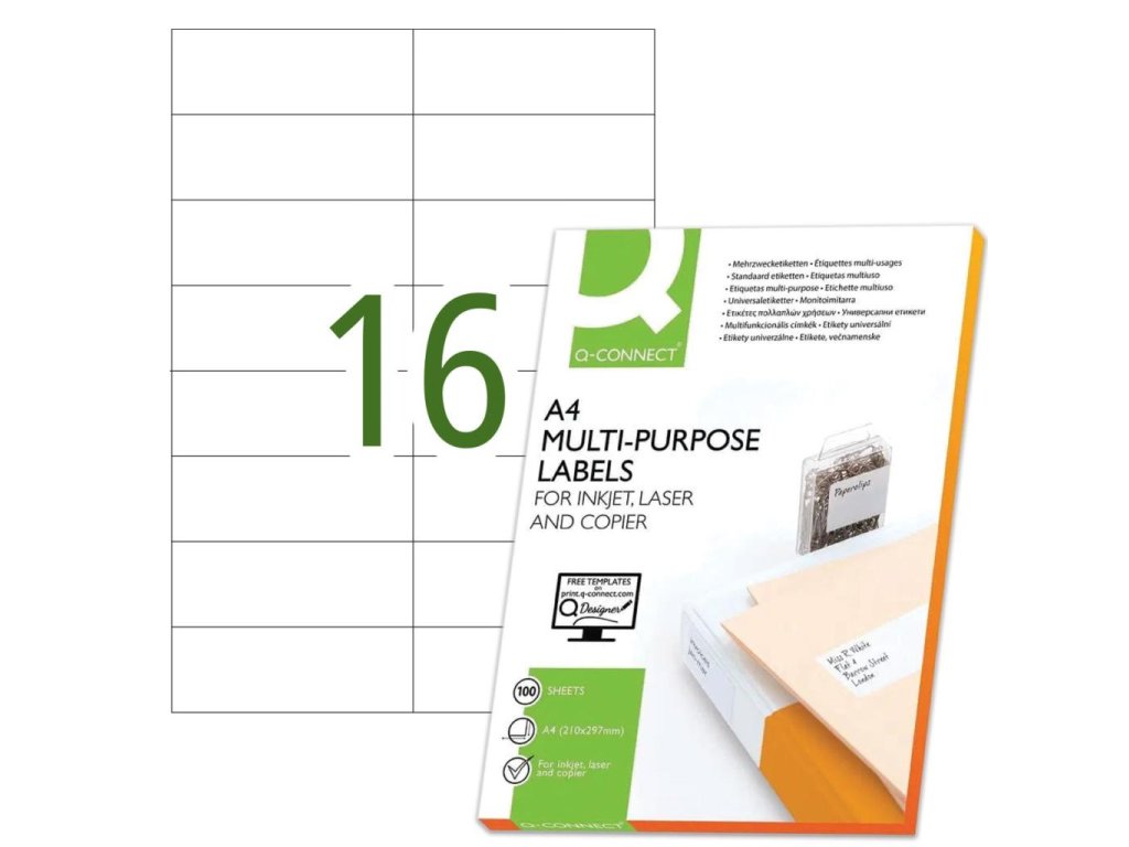 Univerzálne samolepiace etikety pre laserové a atramentové tlačiarne a kopírovacie zariadenia. Formát A4. Farba biela. Balenie 100 hárkov. Etikety na hárku 16 ks.